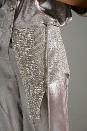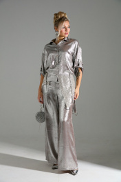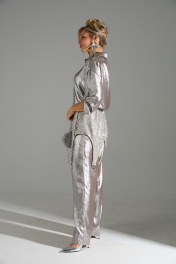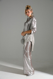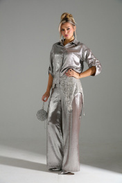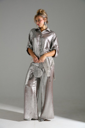 Костюм 2ка, состоящий из рубашки и брюк. Рубашка на пуговицах объёмного силуэта. Рукава дополнены шлейкой с застёжкой на пуговицу для сборки. Брюки широкого объема, прямого силуэта. В комплект входит съёмный пояс из пайеток