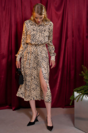 Платье свободного силуэта выполнено из плательной ткани с анималистическим принтом "леопард". Рукав втачной, по низу рукава манжеты на застёжку петлю и пуговицу. Воротник рубашечного кроя, застёжка до линии талии на петли и пуговицы, по лифу клапаны выше линии груди клапаны. Линия талии отрезная на резинке. По переду юбки два глубоких запаха, которые фиксируются навесными петли и пуговицами. По лифу спинки кокетка и отрезная линия талии. К платью прилагается съёмный пояс из основной ткани, на резинке, с металлической пряжкой. Длина по спинке: 123 см Длина рукава с манжетой: 64 см ОГ: 100-104-108-112 см (размер 42-44-46-48) ОТ: 60-64-68-72см (размер 42-44-46-48) ОБ: 128-132-136-140 см (размер 42-44-46-48)