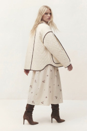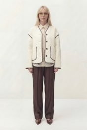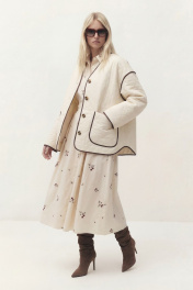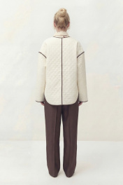 Куртка свободного кроя, облегченная, без подкладки и синтепона. Линия плеча спущена, рукав длинный. V-образный вырез горловины. Застежка однобортная на петли и пуговицы. По бокам накладные карманы. По спинке средний шов. Шов втачивания рукава, низ рукава, горловина, борт, карман, средний шов спинки обработан окантовкой из отделочной ткани. Длина по спинке от высшей точки горловины: 73 см Длина рукава от горловины: 76 см ОГ: 122-126-130-134-138-142 см (размер 42-44-46-48-50-52)