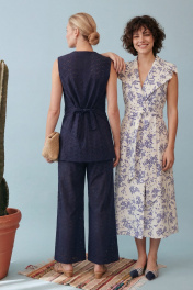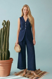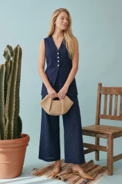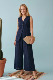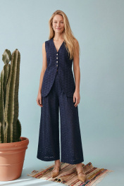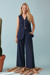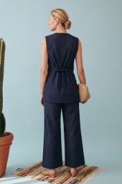 Элегантный летний комплект-двойка в стиле «современная этника» или «курортный шик». Костюм состоит из удлиненного жилета приталенного силуэта и широких брюк. Изделие выполнено из хлопкового полотна с вышивкой ришелье (английское шитье) насыщенного темно-синего цвета. Жилет полуприлегающего силуэт, удлиненный, закрывающий линию бедер на подкладке. Застежка центральная на петли и пуговицы. V-образный, глубокий, по переду низ изделия имеет фигурные закругленные борта. На спинке талевые выточки и в них на уровне талии расположены отлетные хлястики, которые завязываются, обеспечивая идеальную посадку по фигуре и подчеркивая талию. Брюки широкие, свободного кроя. Притачной пояс, с мягкими складками-защипами от линии талии, что создает дополнительный объем и свободу движения. В боковых швах расположены карманы. Брюки имеют частичную подкладку (шорты) для исключения прозрачности кружевного полотна. Жилет: Длина по спинке от высшей точки горловины: 72 см ОГ: 90-94-98-102 см (размер 42-44-46-48) ОТ: 90-94-98-102 см (размер 42-44-46-48) Брюки: ОТ: 68-72-76-80 см (размер 42-44-46-48) ОБ: 102-106-110-114 см (размер 42-44-46-48) Длина с учетом пояса: 102,5 см