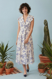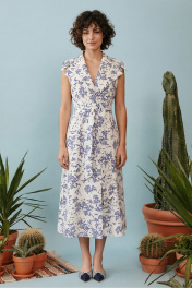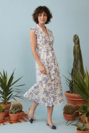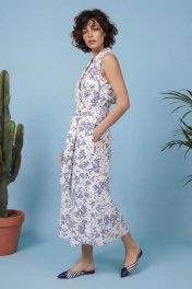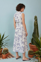 Платье полуприлегающего силуэта, расширенное к низу. По переду воротник пиджачного типа, застёжка на потайные кнопки в боковых швах, прорезные карманы с клапанами. По спинке средний шов и отлетная кокетка. К платью предлагается отлетной пояс, выполненный из основной и отделочной тканей. Пояс застёгивается на петли и пуговицы. Платье: Длина платья по спинке: 121 см ОГ: 92-96-100-104-108 см (размер 42-44-46-48-50) ОТ: 76-80-84-88-92 см (размер 42-44-46-48-50) ОБ: 96-100-104-108-12 см (размер 42-44-46-48-50)