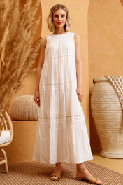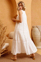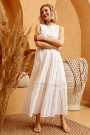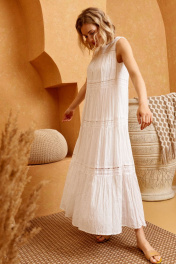 Платье «А»-силуэта, свободного кроя, выполнено из 100% хлопка, на подкладке. По переду округлый вырез горловины и отрезная кокетка из отделочной ткани «ришелье». По спинке застёжка на навесную петлю и пуговицу. Кокетка также выполнена из отделочной ткани. Платье состоит из четырёх воланов в сборку, между которыми вшиты горизонтальные детали из отделочной ткани «ришелье». От линии кокеток переда и спинки воланы сжаты вручную в крэш, что позволяет силуэту платья не добавлять фигуре дополнительный объём и идеально скрадывает все её недостатки. Длина платья: 131 см Обхват груди: 98-102-106 см (размер 44-46-48)
