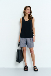 Удлиненные шорты прямого силуэта со складками из гладкой костюмной ткани. Застежка центральная на тесьму молнию и пуговицу. Пояс притачной со шлевками. Передние половинки шорт с наклонными карманами. Длина изделия по боковому шву 50,5 см Длина изделия по шаговому шву 20 см