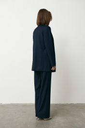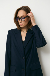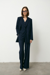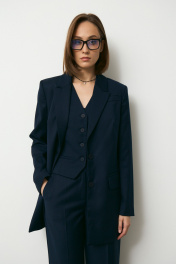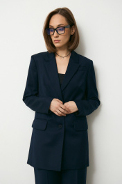 Жакет прямого силуэта, длиной до линии бедер с втачными рукавами до запястья, с воротником пиджачного типа. Застежка центральная на две прорезные петли и пуговицы. На деталях переда обработаны прорезные карманы в рамку с клапанами. На левой детали переда в области лацкана обработан прорезной карман-обманка с листочкой. Спинка с рельефами и средним швом. Изделие на подкладке. Длина изделия по спинки 77 см. Длина рукава 62 см. Собери комплект 2075 темно-синий, 2019 темно-синий, 2055 темно-синий, 3010 темно-синий, 2062 темно-синий, 2069 темно-синий.