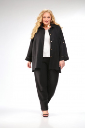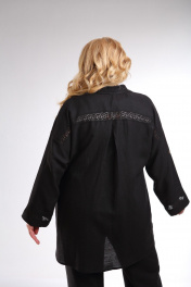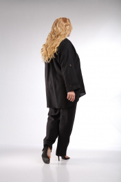 Костюм двухпредметный. Состоит из рубашки и брюк. Рубашка свободного кроя на пуговицах с длинным рукавом. По спинке и по рукаву декоративные вставки из хлопкового кружева. Брюки свободного кроя с боковыми карманами. Верх брюк обработан притачным поясом с резинкой. Длина рубашки по спинке от горловины – 85см. Длина рукава от края горловины – 70см. Длина брюк с учетом пояса- 108 см.