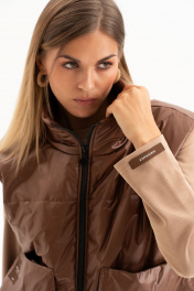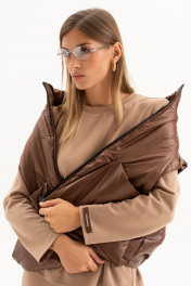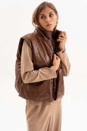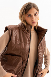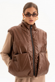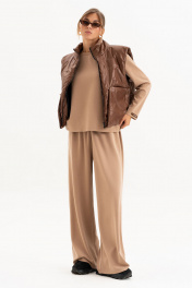 Комплект-тройка для уверенных в себе девушек и женщин,предпочитающих стиль и комфорт.Жилет из плащевой ткани в трендовом коричневом цвете на синтепоне на подкладке с центральной застёжкой на тесьту-молнию,воротником-стойкой,накладными-отложными карманами. Костюм из трикотажного полотна с вискозой подходит для создания базового кэжуал образа,отлично комбинируется с кроссовками и бейсболкой.Лонгслив прямого силуэта с округлой горловиной,длинными рукавами и нашивкой.Широкие брюки с высокой посадкой на резинке по талии обеспечивают комфортное ношение. дл жилета-55 см, длин лонгслива -61см, длина рукава-61 см