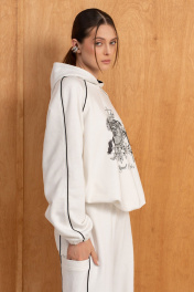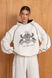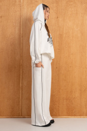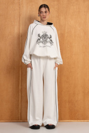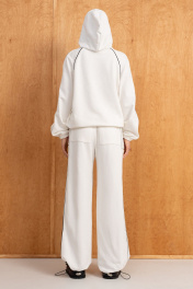 Женский комплект(жилет,свитшот и брюки).Жилет женский на синтепоне на подкладке со смещённой застёжкой на кнопки,воротником-стойкой и карманами.Свитшот прямого силуэта с двойным капюшоном,рукавами-реглан,по низу свитшота резинка с фиксатором-регулировать можно объём.Брюки высокой посадки на резинке,по низу-резинка с фиксатором,благодаря чему форму брюк по низу можно менять.Вертикальные швы, контрасные канты , принт на свитшоте и отделка в капюшоне добавляют образу изюминку.