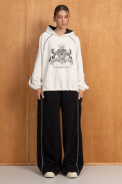 Костюм двойка из качественного трикотажного футерованного полотна.Свитшот прямого силуэта с двойным капюшоном,рукавами-реглан,по низу резинка с фиксатором-регулировать можно объём.Брюки высокой посадки на резинке,по низу-резинка с фиксатором,благодаря чему форму брюк по низу можно менять.Прорезные карманы по бокам,сзади накладные карманы для удобства.Контрасные канты , принт на свитшоте и внутренняя отделка капюшона сеткойкой добавляют образу изюминку.