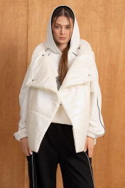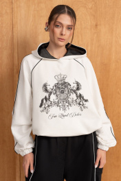 Женский комплект(жилет,свитшот и брюки).Жилет женский на синтепоне на подкладке со смещённой застёжкой на кнопки,воротником-стойкой и карманами.Свитшот прямого силуэта с двойным капюшоном,рукавами-реглан,по низу свитшота резинка с фиксатором-регулировать можно объём.Брюки высокой посадки на резинке,по низу-резинка с фиксатором,благодаря чему форму брюк по низу можно менять.Вертикальные швы, контрасные канты , принт на свитшоте и отделка в капюшоне добавляют образу изюминку.
