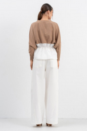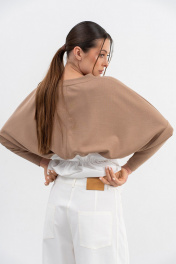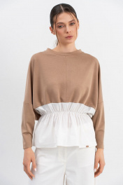 Джемпер необычного кроя трапецивидного силуэта со спущенной линией плеча и небольшим рукавом,низ выполнен из ткани-компаньона (хлопок),по талии резинка.