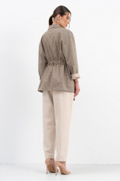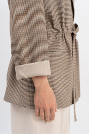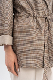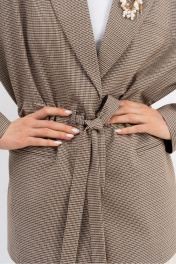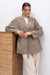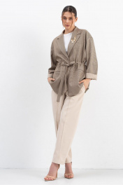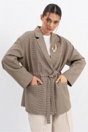Элегантный жакет из костюмной ткани,свободного кроя прямого силуэта со спущенной линией плеча с застёжкой на кулису и поясом.На лацкане декоративная брошь.Свободный крой жакета не сковывает движения,карманы в рамку для практичности и удобства. Жакет подходит для офисных будней,вечерних прогулок.