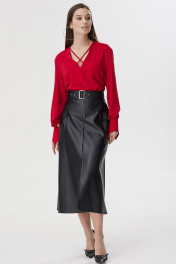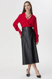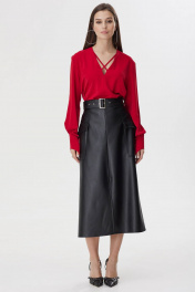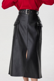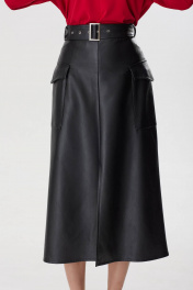 Юбка из эко-кожи на хлопковой основе, расклешенная книзу, на притачном поясе со шлевками для ремня, без подкладки. Переднее полотнище со средним швом, понизу с разрезом. Заднее полотнище с потайной застежкой на молнию в среднем шве. В области бедер обработаны накладные карманы с клапаном. В комплект входит съемный ремень из основной ткани. Длина юбки: 83 см