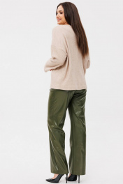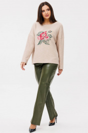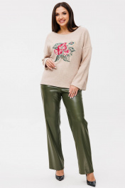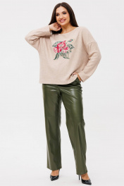 Двухпредметный комплект Ma Сhérie, состоящий из трикотажного джемпера и брюк из экокожи. Джемпер свободного силуэта из трикотажа. Горловина округлая, обработана обтачкой. Полочка цельная, на груди дизайнерская вышивка. Спинка со средним швом. Рукав одношовный втачной длинный, линия плеча спущена. Длина изделия 62,5-64 см в зависимости от размера, длина рукава от горловины 69,5-70 см. Брюки прямые из качественной экокожи. Пояс притачной, застежка на петлю и пуговицу, обработана гульфиком с тесьмой-молнией. Передние половинки с горизонтальными подрезами, в боковых швах функциональные карманы. Задние половинки цельные с накладными карманами. Длина по боковому шву 111-112 см в зависимости от размера. Комплект можно одеть как на торжественное мероприятие, так и для повседневного использования. Джемпер и брюки можно приобрести раздельно. Модели 1128 и 2078 соответственно.