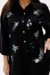 Льняной двухпредметный костюм Ma Cherie, состоящий из рубашки и брюк. Рубашка свободного силуэта. Воротник отложной рубашечного типа. Застежка центральная на петли и пуговицы, спинка с кокеткой. На полочке расположены дизайнерские вышивки. Рукав 3/4 со спущеной линией плеча, одношовный. Длина изделия 68-69,5 см в зависимости от размера, длина рукава 37 см. Брюки-палаццо. Пояс притачной на резинке. Передняя половинка брюк с функциональными карманами с диагональным входом. Длина по боковому шву 107 см. Костюм для повседневного использования. Рубашку и брюки можно приобрести раздельно. Модели 1168 и 2086 соответственно.