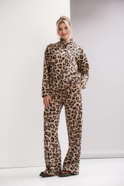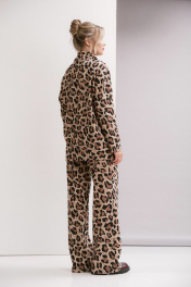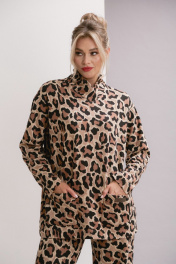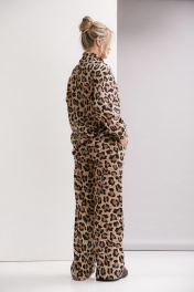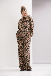 Костюм двухпредметный, состоит из джемпера и брюк. Джемпер трикотажный свободного силуэта, со спущенным плечо и накладными карманами, и уютным воротником с запахом. Брюки прямого силуэта с карманами в боковых швах. Ширина линии талии в брюках регулируется резинкой и шнуром.