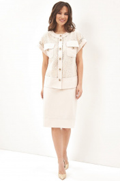 Элегантный женский комплект, состоящий из жакета, топа и юбки. Жакет свободного кроя с центральной застежкой на пришивные пуговицы. Выполнен из нежного ажурного кружева с дополнением из поливискозного полотна. Рукав цельнокроеный. Жакет дополнен накладными нагрудными карманами с клапанами. Топ прямого кроя с цельнокроеным коротким рукавом. Юбка классического кроя, с застежкой по спинке на потайную молнию. По спинке средний шов с разрезом. Длина жакета от плечевого шва 66 см. Длина рукава 15 см. Длина топа от плечевого шва 60см . Длина юбки 65 см.