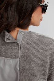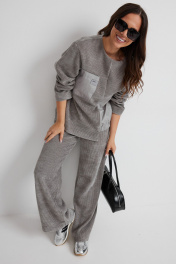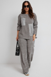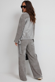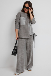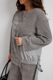 Стильный костюм из джемпера и брюк. Выполнен из фактурного трикотажного полотна (штрукс) в комбинации с красивой мягкой плащевой тканью. Джемпер свободного кроя с застежкой по спинке на кнопки. Рукав слегка спущен. По низу джемпер дополнен красивой сборкой на эластичную тесьму и завязывается в красивый бант. Брюки прямого свободного кроя, с притачным поясом, дополненным эластичной тесьмой. Посадка средняя. По бокам брюки дополнены удобными карманами. Длина спинки 69см. Длина брюк по боковому шву 104см.