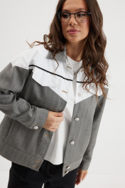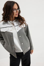 Стильный комплект из куртки и джинсовых брюк. Куртка прямого рубашечного кроя, на подкладке, с центральной застежкой на красивые пуговицы. Горловина обработана отложным воротником. Рукав полной длины с притачной манжетой дополненной застежкой на пришивную пуговицу. Выполнена из двух видов ткани: костюмной ткани с редкими мерцающими пайетками и плащевой ткани. Куртка дополнена удобными боковыми карманами. Джинсы прямого классического кроя с застежкой гульфик на пуговицу и металлическую молнию. Посадка средняя. Дополнены удобными боковыми и задними карманами. Длина куртки от плечевого шва 62см. Длина рукава 60см. Длина брюк по боковому шву 105см.