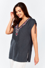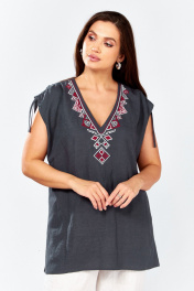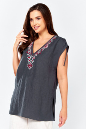 Блуза прямого силуэта.В боковых швах разрезы.Спинка со средним швом. По переду нагрудные вытачки . Горловина с V - образным вырезом , украшена декоративной вышивкой. По плечевому шву обработана кулиса с завязками из основной ткани .
