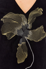 Блуза прямого силуэта. По переду нагрудные вытачки от боковых швов, декоративная вышивка. Низ ассиметричный с отрезной деталью. разрез в левом боковом шве. Плечо слегка спущено. Горловина с V- образным вырезом .