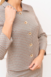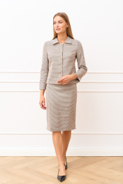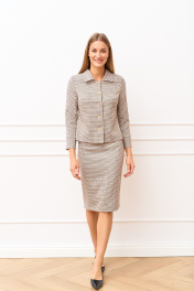 Комплект женский состоит из жакета и юбки. Жакет свободного силуэта на подкладке, воротник стойка-отложной, застёжка центральная бортовая на декоративные петли и пуговицы. Рукав втачной двухшовный, укороченный, с притачной манжетой по низу. Спинка со средним швом. Юбка классическая, зауженная к низу, на поясе. В центральном шве заднего полотнища – застёжка на потайную молнию, снизу разрез. Юбка на подкладке. Длина жакет 53-55 см. длина юбки 65-67 см.