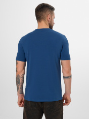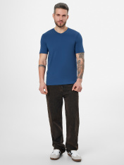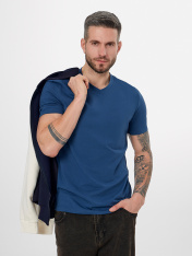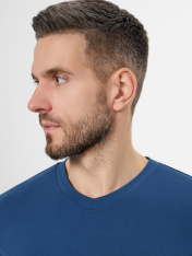 Мужская футболка прилегающего силуэта станет основой для множества образов — от повседневного до более собранного. Ее крой мягко следует формам фигуры, обеспечивая аккуратную и удобную посадку._x000D_ Короткие втачные рукава и V-образный вырез создают классический и лаконичный вид. Все детали обработаны с особым вниманием: шов спинки и окантовка горловины выполнены из основного материала для цельного внешнего вида, а нижние срезы рукавов аккуратно подшиты. Такая обработка гарантирует долговечность, сохраняя форму даже после множества стирок.<br>_x000D_ <br>_x000D_ Основой футболки служит материал с преобладанием натурального хлопка и небольшой добавкой эластана. Этот состав обеспечивает комфорт в течение всего дня, позволяя коже дышать. Ткань мягко тянется,повторяя движения тела, не стесняя их, и быстро возвращает первоначальную форму. <br>_x000D_ <br>_x000D_ Практичный синий цвет легко сочетается с джинсами, шортами или брюками, делая эту модель универсальным элементом базового гардероба._x000D_