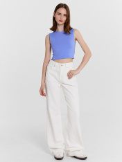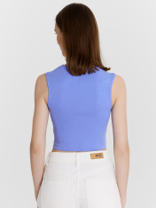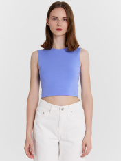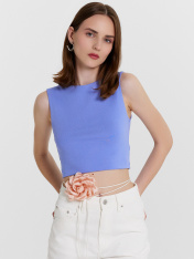 Топ женский прилегающего силуэта из трикотажного полотна рибана. Горловина круглой формы. Передняя деталь топа двойная. Срезы горловины и пройм спинки окантованы бейкой. Топ укорочен.