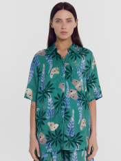 Стильная блуза женская из 100% вискозы. Оверсайз модель с центральной застежкой на пуговицы. На левой детали переда выполнен накладной карман. Горловина круглой формы с рубашечным воротником. Плечо спущено, пройма углублена. Рукав втачной, короткий.Низ блузы прямой. Комфортный лаконичный вариант на каждый день для работы, учебы и повседневных дел. Дополнить можно низом из этой же или другой коллекции на свой вкус. Широкий размерный ряд. Рекомендуем для создания гармоничных casual аутфитов в жаркий сезон года!