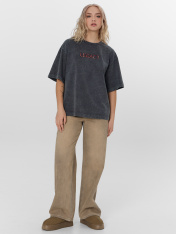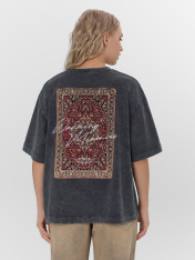 Футболка изготовлена из трикотажного полотна кулирка._x000D_ Футболка свободная, оверсайз._x000D_ Горловина округлой формы обработана обтачкой из рибаны. Шов втачивания обтачки по спинке закрыт тесьмой хб 10мм.Рукава втачные, корткие. Линия плеча спущена._x000D_ Нижние срезы футболки и рукавов обработаны швом вподгибку._x000D_ _x000D_ _x000D_ _x000D_