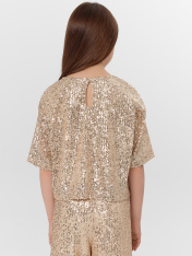 Блузка прямого силуэта, выполнен из пайеток. Вырез горловины круглый. Рукава короткие. Спинка и полочка цельнокройные, спинка длиннее переда. По спинке застежка-капелька на одну петлю WT4-6 и пуговицу d=10mm.