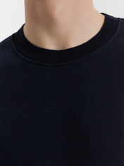 Однотонный мужской джемпер из трикотажного футера. Силуэт прямой, свободный. Вырез круглый, не глубокий, с окантовкой из рибаны. Рукава длинные, с необычной деталью сзади. Спущенная линия плеча дарит свободу движений. Манжеты и пояс сделаны из рибаны. Рекомендуем для стильных расслабленных образов!
