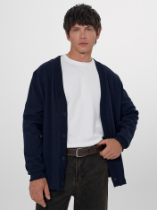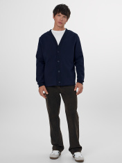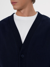 Мужской кардиган станет надежной базой в прохладную погоду. Он выполнен из плотного эластичного трикотажа, который хорошо держит форму и приятен на ощупь. Свободный крой с V-образным вырезом и длинными рукавами создает расслабленный, но аккуратный силуэт.<br>_x000D_ <br>_x000D_ У кардигана удобная застежка на пуговицы, отдельная планка для застежки и эластичные манжеты для комфортной посадки. По бокам расположены аккуратные карманы. Состав с преобладанием хлопка обеспечивает натуральность и воздухообмен, адобавление полиэстера и эластана добавляет ткани прочность, легкое растяжение и упругость. <br>_x000D_ <br>_x000D_ Этот кардиган легко сочетается с джинсами, брюками или футболкой, становясь идеальным выбором для работы, прогулок или отдыха — где важны комфорт,качество и сдержанный стиль.