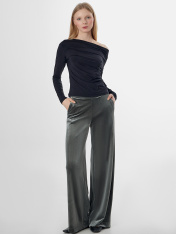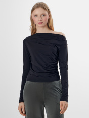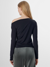 Джемпер прилегающего силуэта. Перед и спинка цельнокроеные. Драпировка в боковом шве с жилкой тканой 6мм Е7112 arteks. Горловина обработана обтачкой из основного полотна. Одно плечо спущено. Низ изделия и рукавов обработаны швом вподгибу. Внутри держатели из репсовой ленты SFLR-4 5мм цв.черный (SFLR-3 5мм цв.белый по заданию).