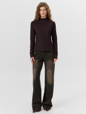 Женский джемпер прилегающего кроя — это элегантная и утонченная модель, прекрасно подчеркивающая фигуру и создающая аккуратный силуэт. Вырез горловины в форме лодочки со стойкой добавляет образу нежности и изысканности, делая акцент на линии шеи и ключицах. Длинные рукава обеспечивают тепло и делают джемпер универсальным для демисезонной носки. Нижние срезы изделия и рукавов аккуратно обработаны швом вподгибку, что улучшает внешний вид и повышает долговечность вещи. Материал, из которого выполнен джемпер, содержит искусственные волокна и эластан, благодаря чему изделие хорошо тянется, комфортно сидит на теле и не теряет форму даже после множества стирок. Эта модель легко сочетается с юбками, брюками или джинсами, подходя как для делового стиля, так и для повседневных образов._x000D_