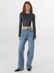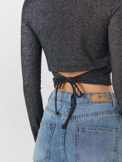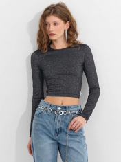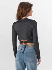 Укороченный джемпер из лимитированной коллекции Mark Formelle x Ольга Бузова создает эффектный и женственный образ для особенного выхода. Прилегающий силуэт мягко подчеркивает линии фигуры, а крой с завышенной талией визуально вытягивает силуэт._x000D_ Материал с добавлением люрекса создает мягкое мерцание, которое привлекает внимание и переливается при движении. Круглая горловина аккуратно обработана бейкой, что обеспечивает аккуратный и прочный край. <br>_x000D_ <br>_x000D_ Изюминкой модели является спинка: она украшена фигурным вырезом, который подчеркивает линию лопаток. Низ спинки оформлен декоративными завязками, создающими изящный акцент и позволяющими немного регулировать посадку._x000D_ Сочетание полиэстера, люрекса, вискозы и эластана делает ткань эластичной, легкой и приятной на ощупь. Она мягко облегает тело, не стесняя движений. <br>_x000D_ <br>_x000D_ Этот джемпер станет ярким выбором для вечеринки, свидания или коктейля, где важно подчеркнуть индивидуальность и безупречный стиль._x000D_