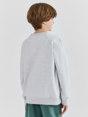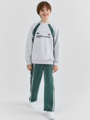 Свитшот для мальчиков свободного силуэта. Рукава длинные, реглан, с отрезными манжетами из _x000D_ рибаны. По переду отрезные детали вдоль шва притачивания рукава реглан. Горловина круглой _x000D_ формы, обтачка из трикотажного полотна рибаны 2*2. Шов втачивания рибаны по спинке закрыт _x000D_ х/б тесьмой. По нижнему срезу изделия притачен _x000D_ пояс из рибаны. _x000D_