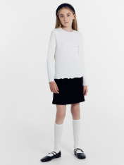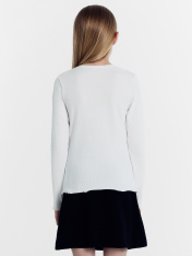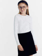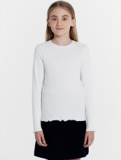 Однотонный джемпер прилегающего силуэта для девочек. Вырез круглый, не глубокий. Рукава длинные. Фактура полотна – в рубчик. Идеально для школы и мероприятий, предполагающих деловой стиль одежды.