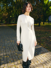Эффектное платье женское миди, полуприлегающего силуэта. Горловина формы - лодочка. Рукава длинные. Спереди модель с горизонтальным подрезом. Нижняя часть платья с запахом. Спинка со средним швом и застежкой на потайную молнию. Идеальный выбор для тех, кто ищет базовый и комфортный наряд на холодное время года. Изготовленное из мягкого материала - интерлок, это платье обеспечивает комфорт даже в прохладную погоду. В составе изделия - вискоза. Миди-длина добавляет образ изысканности. Платье легко комбинируется с различными аксессуарами и обувью. Подойдет для различных мероприятий, будь то прогулка по городу, встреча с друзьями или романтический ужин. С его помощью вы сможете легко создать как casual, так и более строгий образ. Рекомендуем на осень и демисезон!