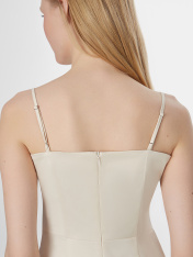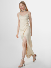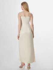 Платье женское полуприлегающего силуэта, длина макси. Перед состоит из двух деталей с заложенными складками в боковой шов. Спинка из отдельных частей. Юбка отрезная, с разрезом спереди и с заложенными складками в боковой шов, линия шва на талии. Сзади потайная молния (Invisible №4, Gizli 4\4, 5мм). Верх обработан обтачкой из основного полотна с дублерином. Изделие на бретелях с регулировкой (рамка 806L, 6мм; кольцо М006, 6мм). Низ изделия вподгибку. _x000D_