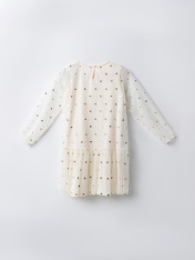 Нарядное платье А-образного силуэта для девочек. Изготовлено из полупрозрачной воздушной сетки с подкладкой из хлопковой кулирки. Вырез круглый, классический. На спинке застегивается на пуговицу. Рукава объемные, длинные. Отличный вариант для утренников и праздников! _x000D_
