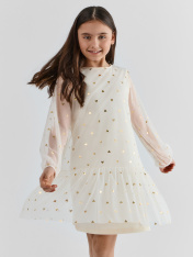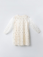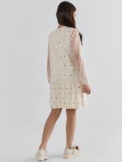 Нарядное платье А-образного силуэта для девочек. Изготовлено из полупрозрачной воздушной сетки с подкладкой из хлопковой кулирки. Вырез круглый, классический. На спинке застегивается на пуговицу. Рукава объемные, длинные. Отличный вариант для утренников и праздников!