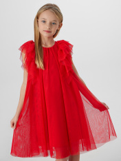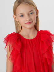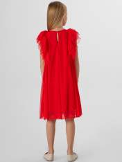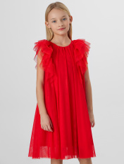 Платье А-силуэта. Спинка и перед цельнокройные. Вырез горловины круглый. По спинке застежка-капелька на одну петлю WT4-6 и пуговицу d=10mm. Вдоль верхней части проймы рукава расположено три слоя рюш, которые переходят с переда на спинку. Подкладка из трикотажного кулирного полотна.