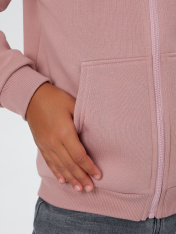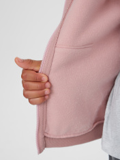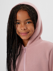 Жакет из трикотажного футера с теплым подчесом. Спущенная линия плеча гарантирует свободу движений. Прямой свободный силуэт, уютный капюшон, длинные рукава на манжетах, удобный карман-кенгуру, центральная застежка на молнию – эта модель наверняка понравится вашей девочке. _x000D_