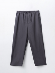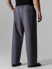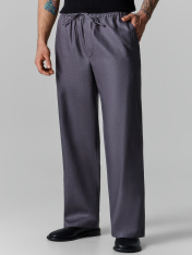 Брюки прямые, посадка средняя._x000D_ Пояс отрезной с эластичной тесьмой внутри. На поясе пробиты петли и втянут шнур с застроченными концами. _x000D_ На деталях переда карманы с отрезным бочком. По переду имитация гульфика._x000D_ На задней половинке брюк справа прорезной карман-обманка с листочкой._x000D_ Нижние срезы обработаны в подгибку с закрытым срезом._x000D_ _x000D_ _x000D_ _x000D_