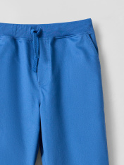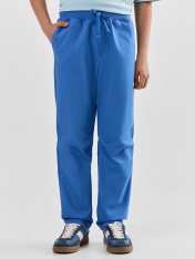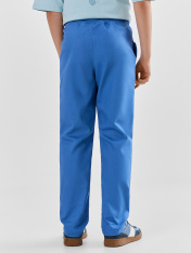 Брюки из текстильного полотна. Силуэт прямой, немного зауженный к низу. Пояс из трикотажного полотна рибана, с регулировочным шнуром. Есть удобные карманы-хулиганы. Имитация гульфика. Все отделочные строчки выполнены толстыми нитками. Стильные брючки!