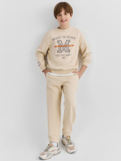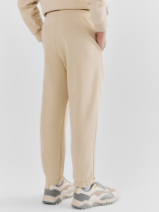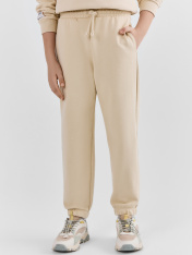 Брюки изготовлены из трикотажного полотна футер. Брюки свободного силуэта. Сиденье немного спущено. В боковых швах обработаны карманы. Подкладка карманов из кулирки._x000D_ Пояс отрезной с эластичной тесьмой внутри. В передней части с лицевой стороны пробиты петли и втянут шнур (с застр. концами)._x000D_ Низ брюк обработан в подгибку с эластичной тесьмой внутри.