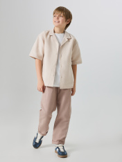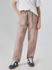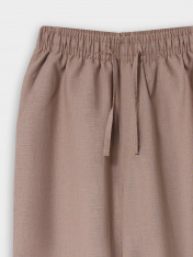 Брюки прямого силуэта. Посадка средняя. Пояс цельнокроеный с эластичной тесьмой внутри. На поясе пробиты петли, заправлен шнур из основного полотна. По переду имитация гульфика, обработаны карманы с наклонным входом от боковых швов. Низ изделия с отворотами. _x000D_ _x000D_ _x000D_