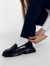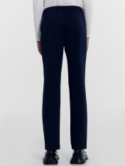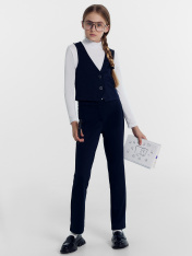 Брюки прямого силуэта. Посадка высокая. Пояс отрезной с регулировкой. По переду изделия имитация карманов, застежка на молнию и пуговицу. Низ изделия обработан швом в подгибку.