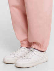 Брюки для девочек. Посадка на талии. Пояс цельнокроеный , внутрь застрочена эластичная тесьма 40RV. По переду декоративные фигурные подрезы, отстрочены . Низ изделия обработан швом в подгибку, внутрь застрочена эластичная тесьма 20RV.