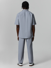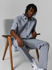 Сорочка верхняя мужская прямого силуэта из ткани, длиной до середины бедер. Рукава короткие втачные. _x000D_ По переду обработана застежка на петли и пуговицы. 7 рубашечных пуговиц на 4 прокола диаметром 10-12 мм._x000D_ Воротник стояче-отложной с отрезной стойкой._x000D_ Спинка с отрезной горизонтальной двойной кокеткой. По отлету воротника, по плечевому шву, по пройме и кокетке проложена отделочная строчка на 5мм от шва._x000D_ Низ изделия и рукавов обработан швом вподгибку с закрытым срезом._x000D_ Брюки из ткани полной длины с классической линией талии. _x000D_ Силуэт прямой, брюки заужены немного к низу._x000D_ Пояс отрезной отстроченный, с эластичной тесьмой внутри и шнурком из основного полотна (втянут с изнанки). По переду имитация гульфика, складки талевые. В боковых швахкарманы._x000D_ На задних деталях брюк талевые вытачки._x000D_ Низ брюк обработан швом в подгибку с открытым срезом._x000D_ _x000D_